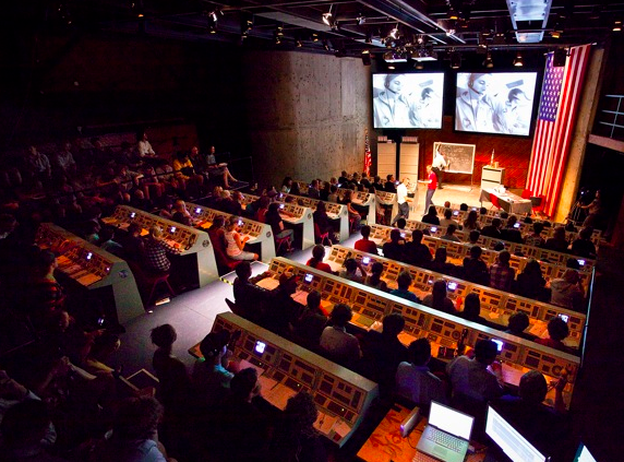 In New Zealand I think we may often define work as immersive when it is in fact possibly interactive, but more likely participatory. Hackman’s Apollo 13, directed by Kip Chapman (and pictured below), is an interesting case study. If we were to apply the definitions above (already a problematic act, considering the mutability of the word and the fact I’ve spent all this time saying it’s not a genre), taking ‘immersive’ to mean a wide ranging play area, usually not a theatre, in which audience have complete agency - considerations which have come to increasingly encapsulate the term, internationally at least - Apollo 13 does not necessarily accord. Yes, the audience are sitting at an incredible fully reconstructed 1960s Houston NASA control centre, however due to the very nature of the space, the strictness of the Houston Command story world, and the various roles the audience take on, this wouldn’t allow total free range play. Then again, that space station is most certainly an immersive environment. I mean, if that is not an environment which could be described as 'immersive', what is, right?